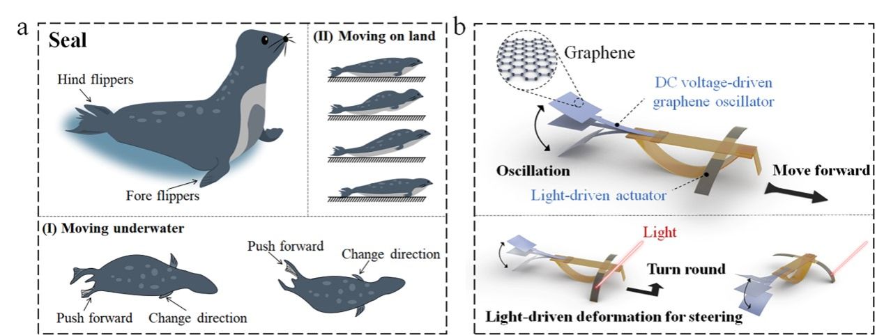 海豹能在水下和地面運動。在水下,海豹主要依靠擺動后鰭來提供向前推力,并通過拍打前鰭來改變運動方向。相比之下,海豹在陸地上則主要通過自身的背腹起伏向前移動。由于缺乏后鰭連續拍打所提供的推力,海豹在地面上的移動速度相對較慢。受海豹兩種運動模式的啟發,團隊設計了一種仿海豹柔性機器人。該機器人包含兩個部分:(1)模擬海豹后鰭的石墨烯振蕩器,在直流電壓驅動下產生連續拍打動作,為運動提供驅動力;(2)兩側安裝柔性光驅動器,模擬海豹的前鰭用于調整運動方向。