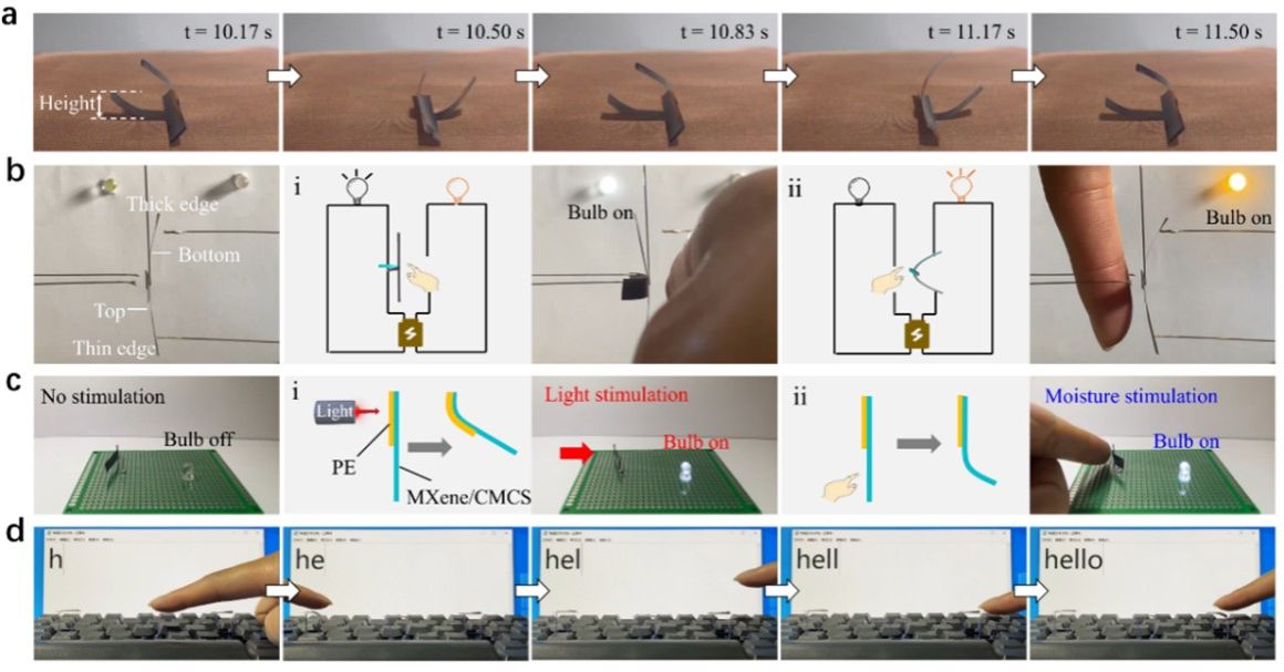 此外,該團隊還與哈爾濱工業大學彭慶宇教授合作,開發了一種具有“類二極管式”變形行為的濕度響應MXene柔性薄膜驅動器。基于其厚度梯度結構以及MXene/羧甲基殼聚糖復合物對水分子的高度敏感性,該薄膜驅動器能夠在水分梯度刺激下產生“類二極管式”的驅動變形行為,其變形行為與厚度梯度方向以及水分源的方向高度相關。當水分刺激復合膜底部時,薄膜的彎曲軸垂直于厚度梯度方向;當水分刺激復合膜頂部時,薄膜的彎曲軸平行于厚度梯度方向。基于該柔性驅動器獨特的濕度響應行為,發展了一系列智能應用,包括水分梯度刺激下的柔性自振蕩器件,以及基于人體代謝水分刺激的智能非接觸開關、非接觸鍵盤、可穿戴智能熱管理服飾、可識別人體呼吸狀態的自供電傳感器等。相關成果以題為“MXene/Carboxymethyl Chitosan Moisture Responsive Soft Actuator with Diode-Like Actuation for Versatile Applications Driven by Human Metabolism”的論文發表在《Advanced Science》上。