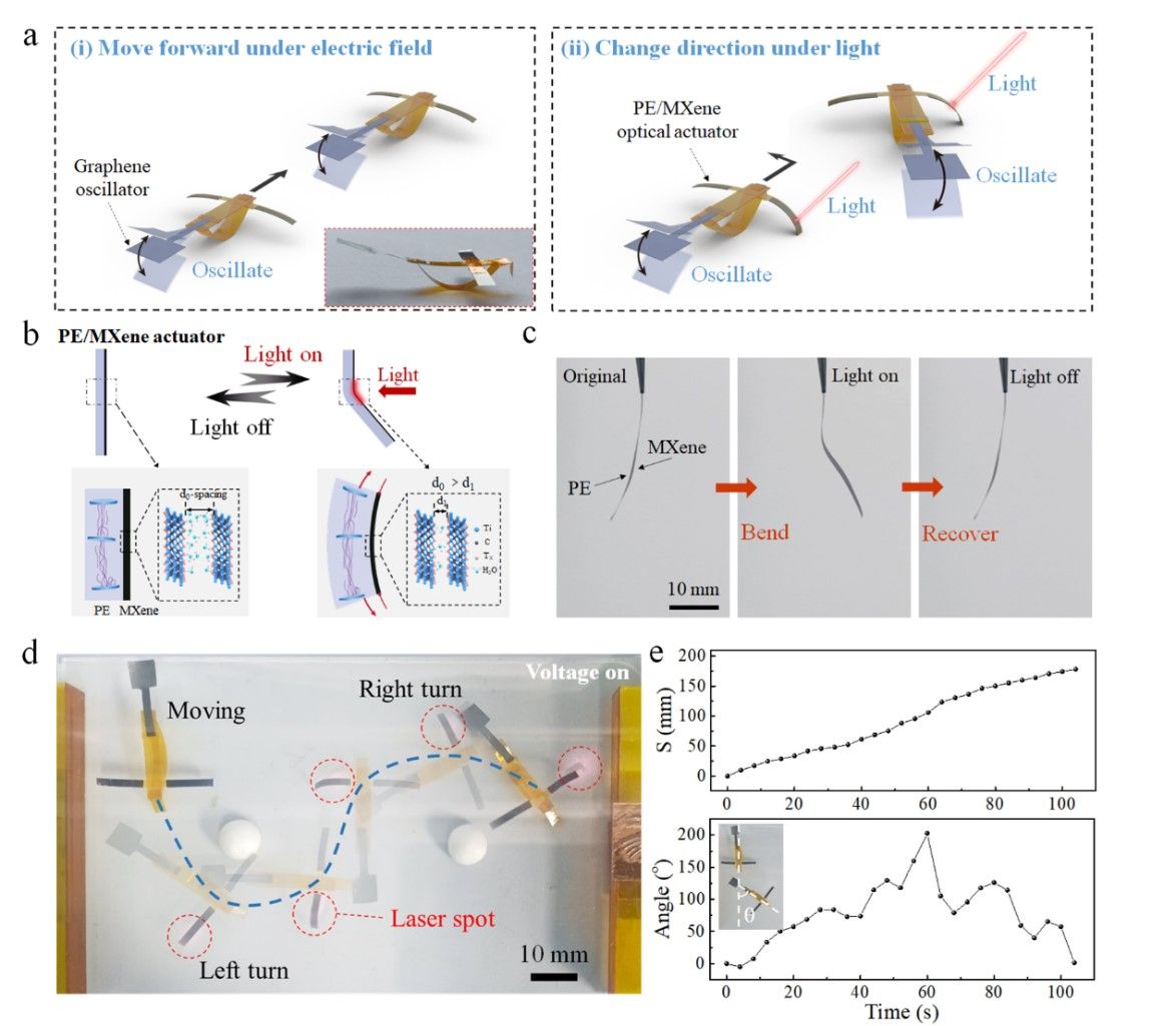 圖3 以石墨烯振蕩器為馬達的仿海豹機器人在電場驅動下自主爬行運動,及攜帶物體運動
